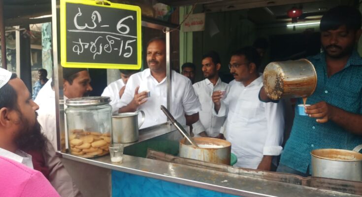 ఆర్.బి.ఎం:రాయచోటి: రాయచోటి పట్టణంలో ఓ ప్రారంభ కార్యక్రమానికి హాజరైన శ్రీకాంత్ రెడ్డికి ఓ అభిమాని తన టీ హోటల్ నందు ఇచ్చిన టీ రుచి చీఫ్ విప్ శ్రీకాంత్ రెడ్డిని మైమరపించింది. పట్టణంలోని బోస్ నగర్ వీధికి ఎదురుగా జబీవుల్లా అనే అభిమాని టీ స్టాల్ పెట్టుకుని జీవనం సాగిస్తున్నాడు. టీ స్టాల్ సమీపంలోనే ఓ ప్రారంభ కార్యక్రమానికి హాజరైన శ్రీకాంత్ రెడ్డిని తన టీ స్టాల్ ను సందర్శించాలని అభిమాని కోరగా శ్రీకాంత్ రెడ్డి వెళ్లి టీ సేవించారు. రోజుకు పాలు ఎన్ని ఖర్చు అవుతున్నాయి.. వ్యాపారం బాగుందా అని శ్రీకాంత్ రెడ్డి అడిగి తెలుసుకున్నారు.స్వయంశక్తితో అభివృద్ధి చెందుచున్న జబీవుల్లాను శ్రీకాంత్ రెడ్డి అభినందించారు.