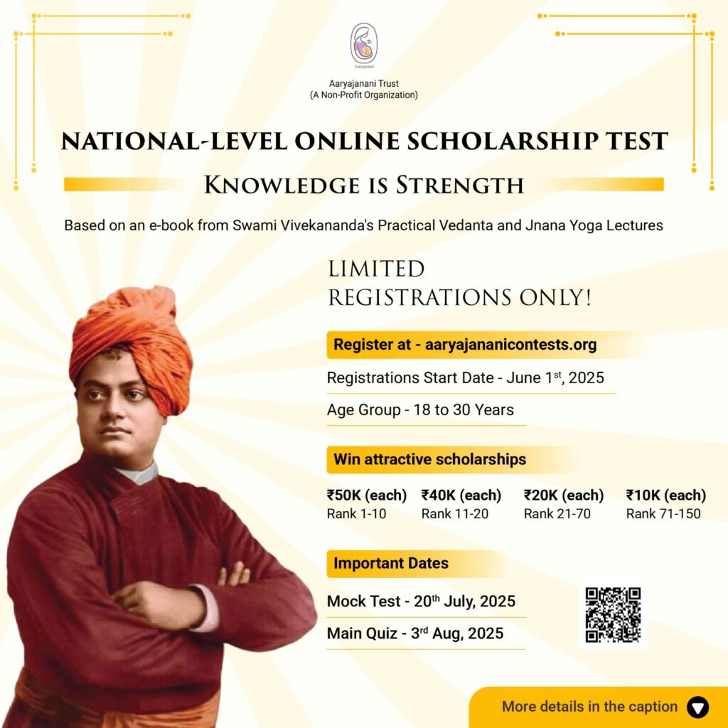 హైదరాబాద్: దివ్య సంతానం కోరుకునే దంపతులకు రామకృష్ణ మఠం ఆధ్వర్యంలో మార్గనిర్దేశం చేస్తున్న *ఆర్య జనని* యువతకు స్కాలర్ షిప్పులు అందించేందుకు మరోసారి ముందుకు వచ్చింది. ఇందుకోసం18 నుంచి 30 సంవత్సరాల లోపు యువతీ యువకులకు జాతీయస్థాయి ఆన్ లైన్ స్కాలర్షిప్ టెస్ట్ నిర్వహించనుంది. స్వామి వివేకానంద ప్రాక్టికల్ వేదాంత, జ్ఞాన యోగ ప్రసంగాల ఆధారంగా రూపొందించిన నాలెడ్జ్ స్ట్రెంత్ అనే పుస్తకంపై టెస్ట్ నిర్వహించనుంది. మాక్ టెస్ట్ జూలై 20న జరగనుంది. ఇప్పటికే రిజిస్ట్రేషన్ల ప్రక్రియ ప్రారంభమైంది. ఆర్యజనని వెబ్సైట్ https://aaryajananicontests.org/ ద్వారా రిజిస్ట్రేషన్ చేసుకోవాలని డాక్టర్ అనుపమ రెడ్డి తెలిపారు.